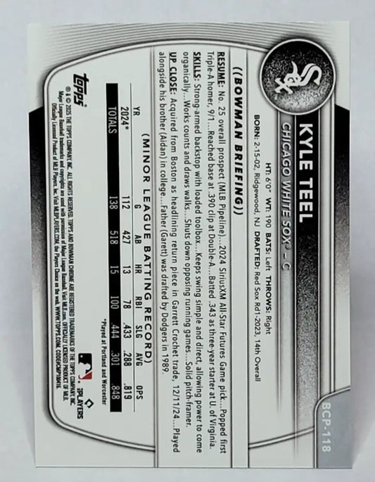 #BCP-118 2025 Bowman Chrome Kyle Teel Chicago White Sox