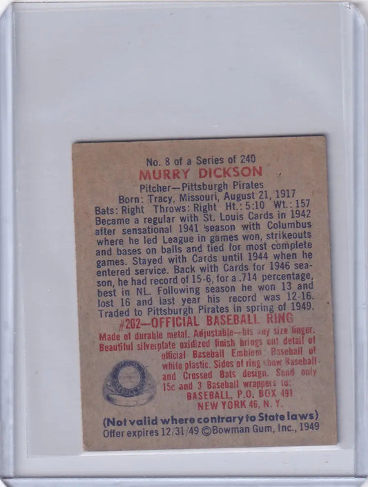 1949 Bowman Baseball #8 Murry Dickson RC - Pittsburgh Pirates