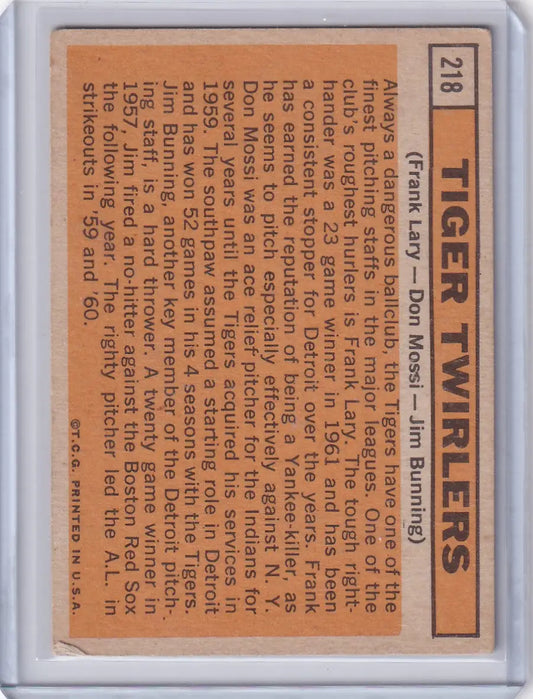 1963 Topps 218 Tiger Twirlers - Frank Lary / Don Mossi / Jim Bunning