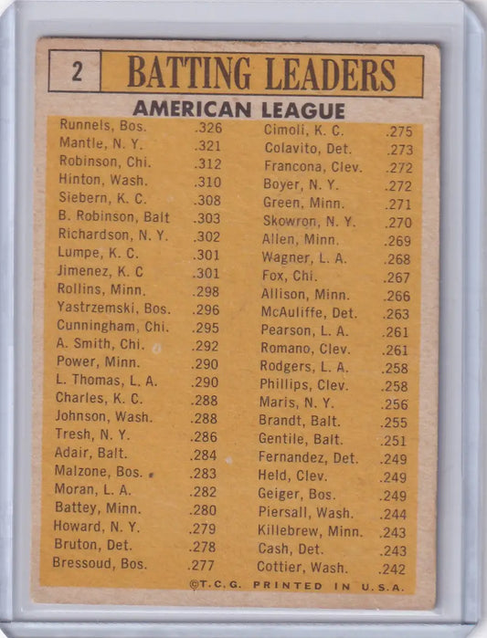 1963 Topps 2 1962 AL Batting Leaders - Runnels/Mickey Mantle/Robinson/Hinton