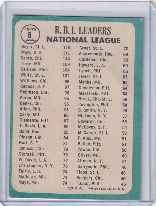 1965 Topps Baseball #6 NL 1964 RBI Leaders - Boyer / Santo / Mays