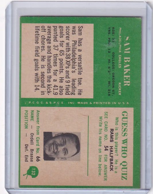 1966 Philadelphia Football #132 Sam Baker - Philadelphia Eagles