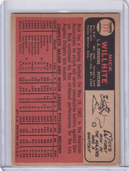 1966 Topps Baseball #171 Nick Willhite - Los Angeles Dodgers