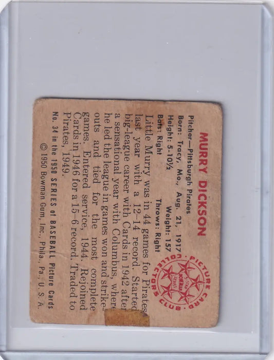 1950 Bowman Baseball #34 Murry Dickson - Pittsburgh Pirates
