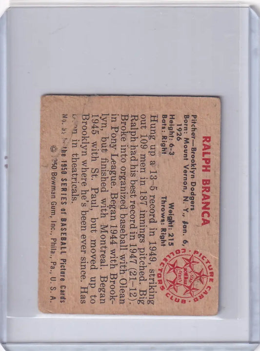 1950 Bowman Baseball #59 Ralph Branca - Brooklyn Dodgers