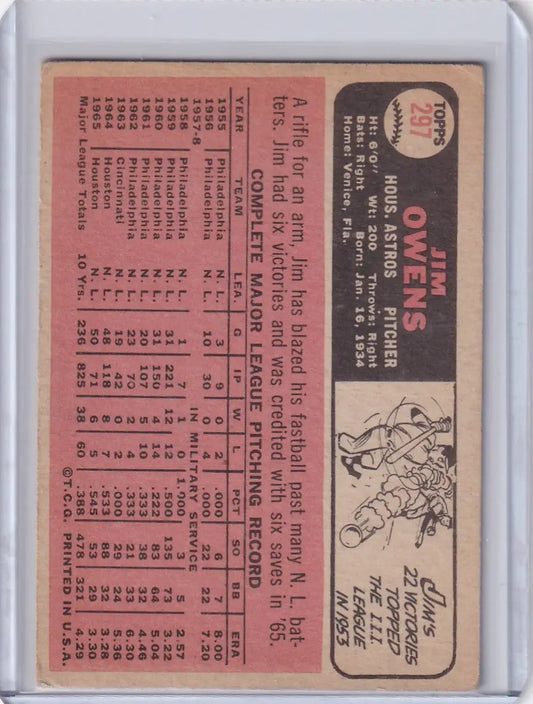 1966 Topps Baseball #297 Jim Owens - Houston Astros