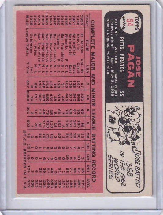 1966 Topps Baseball #54 Jose Pagan - Pittsburgh Pirates