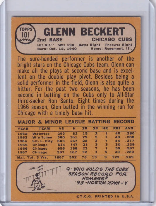 1968 Topps Baseball #101 Glenn Beckert - Chicago Cubs