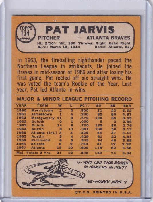 1968 Topps Baseball #134 Pat Jarvis - Atlanta Braves