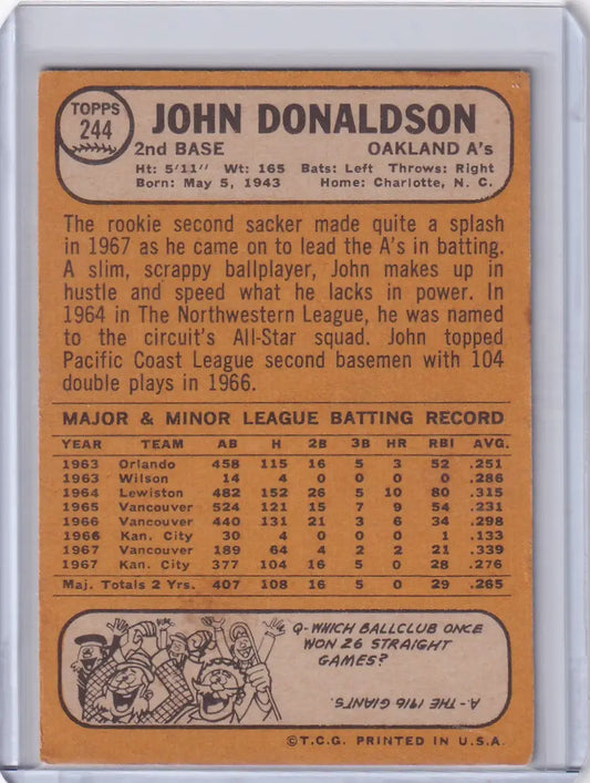 1968 Topps Baseball #244 John Donaldson - Oakland Athletics RC