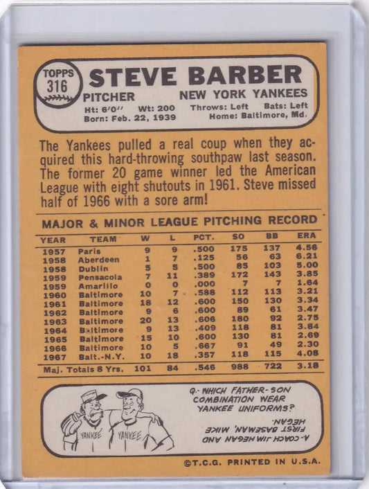 1968 Topps Baseball #316 Steve Barber - New York Yankees