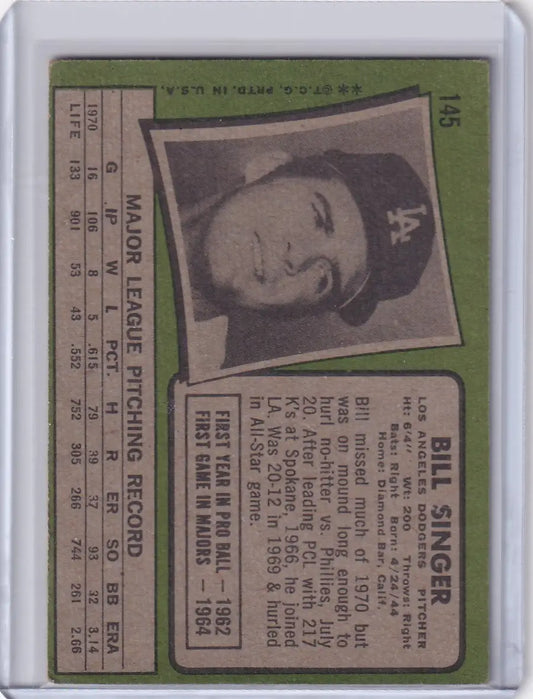 1971 Topps Baseball #145 Bill Singer - Los Angeles Dodgers