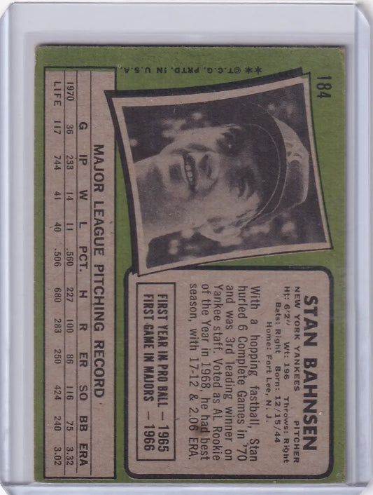 1971 Topps Baseball #184 Stan Bahnsen - New York Yankees