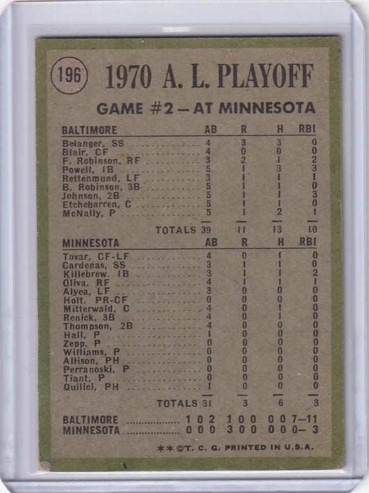 1971 Topps Baseball #195 AL Playoffs Game 1 - Powell Muscles Twins!