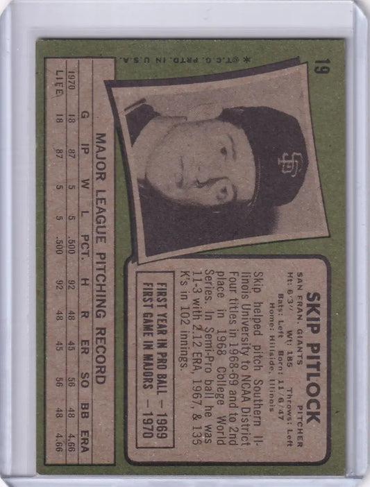 1971 Topps Baseball #19 Skip Pitlock - San Francisco Giants RC