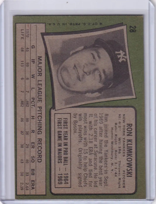 1971 Topps Baseball #28 Ron Klimkowski - New York Yankees