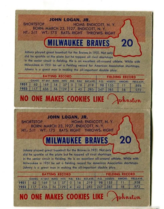 1953 Johnston Cookies Johnny Logan #20 Card Lot Milwaukee Braves x2