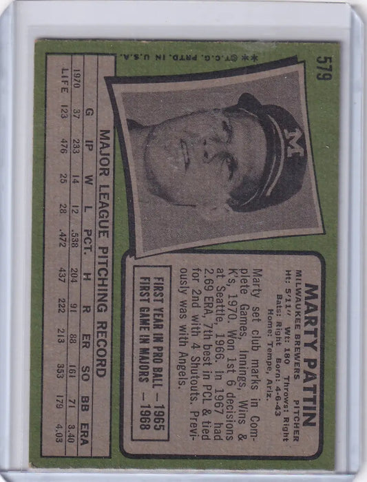 1971 Topps Baseball #579 Marty Pattin - Milwaukee Brewers