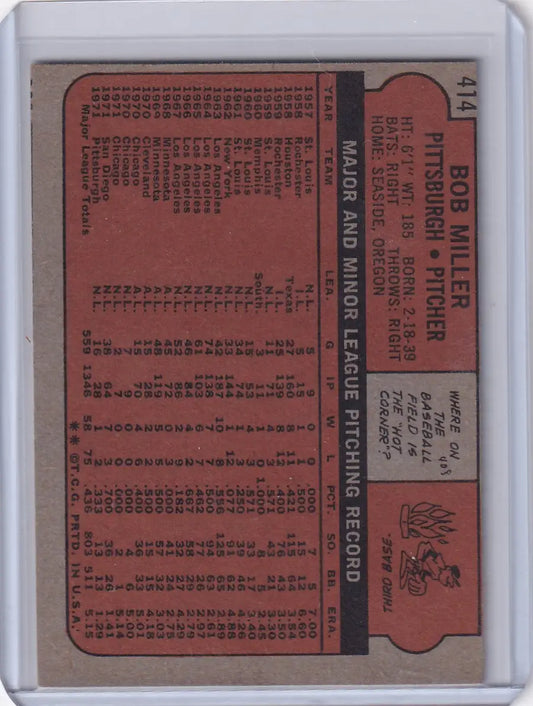 1972 Topps Baseball #414 Bob Miller - Pittsburgh Pirates