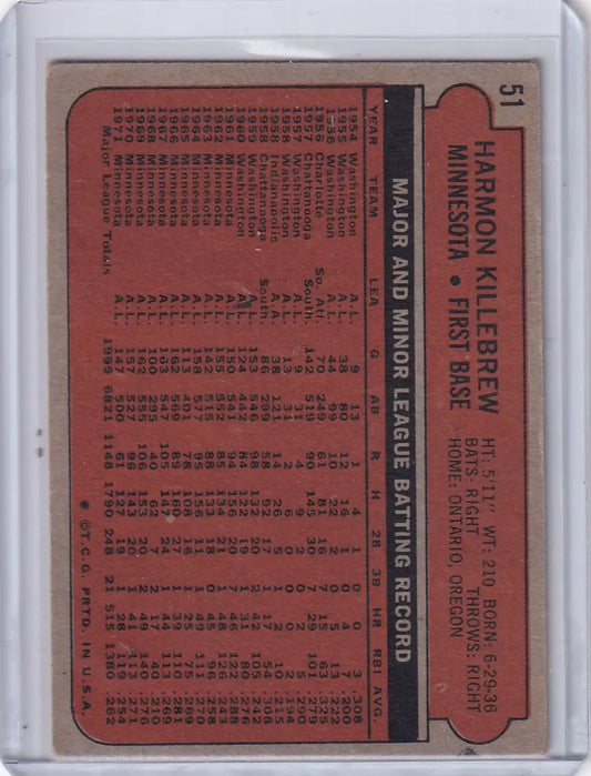 1972 Topps Baseball #51 Harmon Killebrew - Minnesota Twins