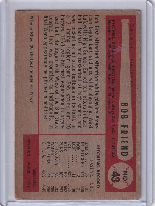 1954 Bowman #43A Bob Friend (20 Shutouts) - Pittsburgh Pirates
