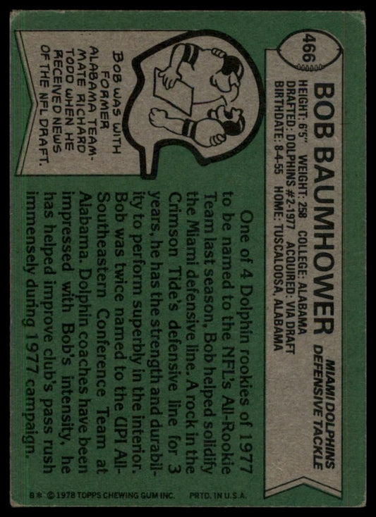 1978 Topps Bob Baumhower #466 Rookie Miami Dolphins Football Card NFL Sports