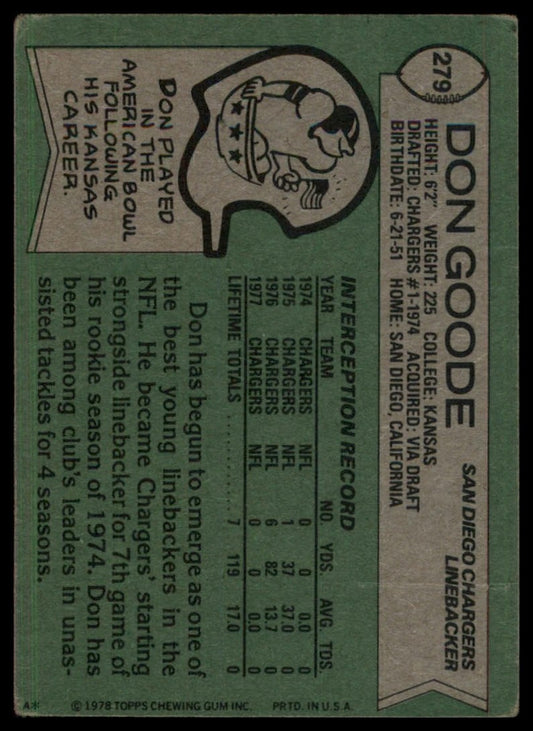 1978 Topps Don Goode #279 San Diego Chargers Football Card NFL Sports