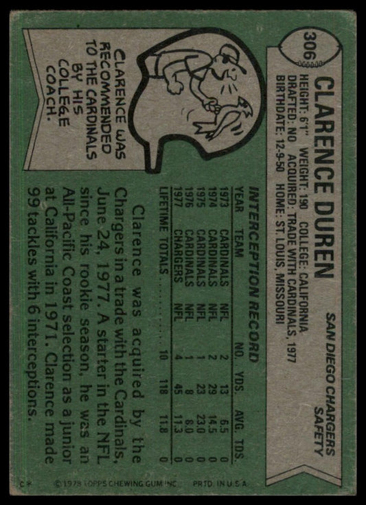 1978 Topps Clarence Duren #306 Rookie San Diego Chargers Football Card NFL Sport
