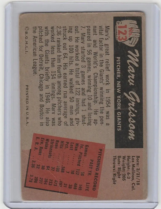 1955 Bowman #123 Marv Grissom New York Giants VGEX
