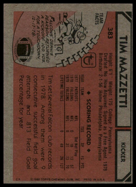 1980 Topps Tim Mazzetti #383 Atlanta Falcons Football Card NFL Sports