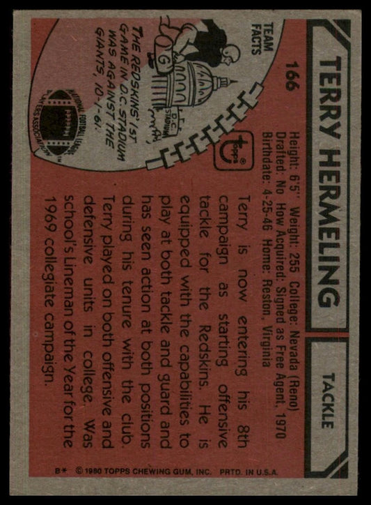 1980 Topps Terry Hermeling #166 Washington Redskins Football Card NFL Sports