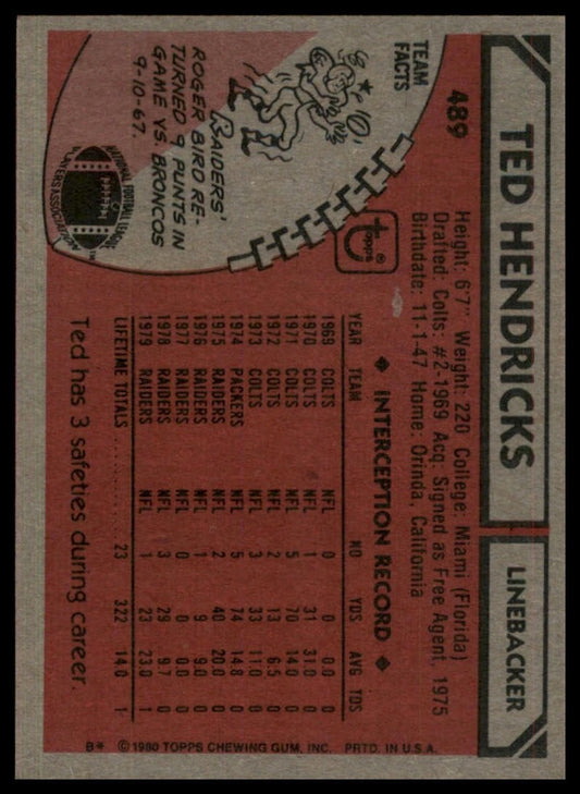 1980 Topps Ted Hendricks #489 Oakland Raiders Football Card NFL Sports
