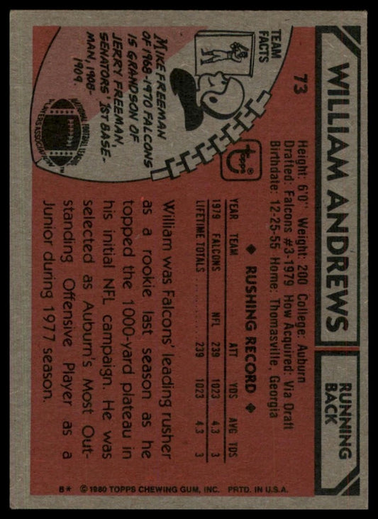 1980 Topps William Andrews #73 Atlanta Falcons Football Card NFL Sports