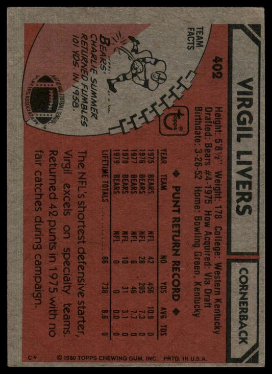 1980 Topps Virgil Livers #402 Chicago Bears Football Card NFL Sports