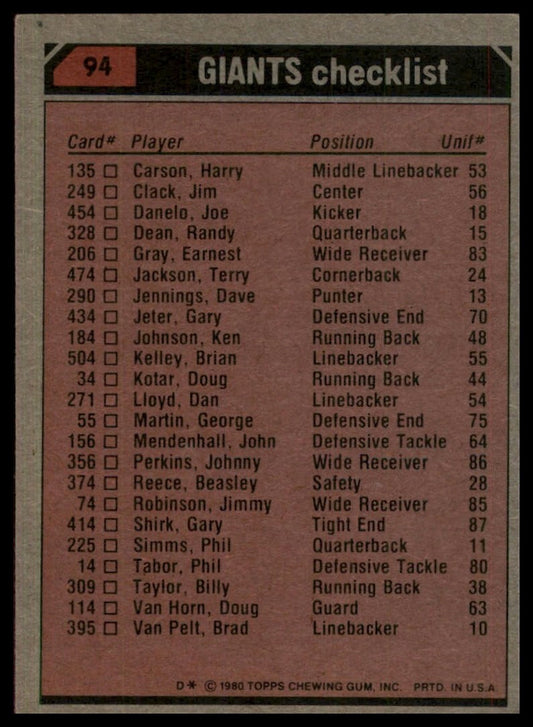 1980 Topps Team Leaders Carson Jackson Martin #94 Rookie New York Giants NFL