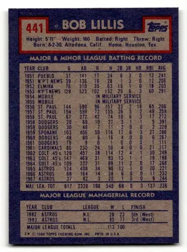 1984 Topps #441 Bob Lillis Houston Astros Baseball Cards NM ID:53428
