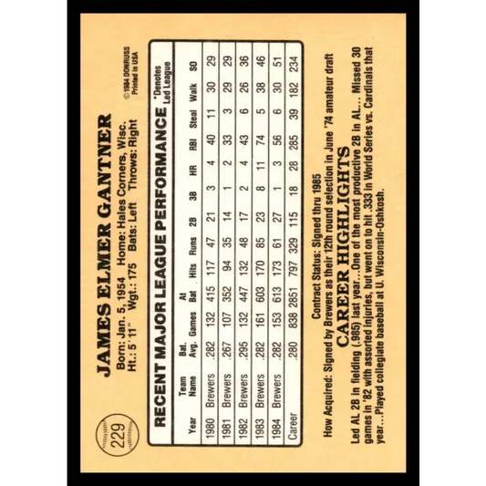 1985 Donruss #229 Jim Gantner F Fair Milwaukee Brewers Baseball Card