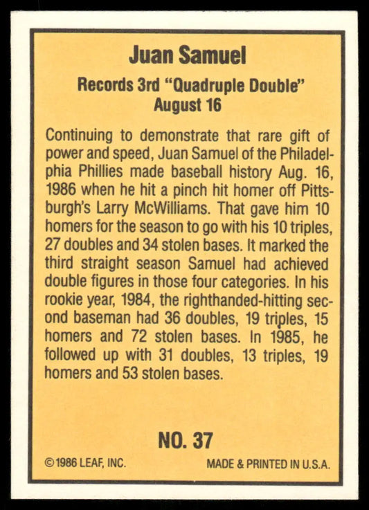 1986 Donruss Highlights Juan Samuel #37 Baseball
