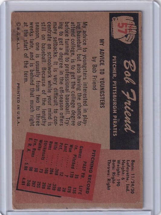 1955 Bowman Baseball #57 Bob Friend - Pittsburgh Pirates