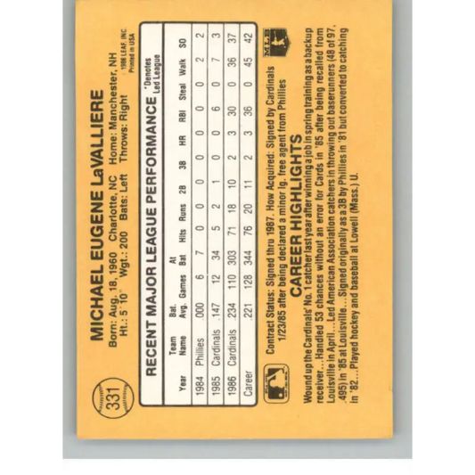 1987 Donruss #331 Mike LaValliere EX RC Rookie St. Louis Cardinals Baseball Card