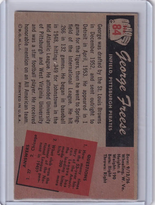 1955 Bowman Baseball #84 George Freese - Pittsburgh Pirates RC