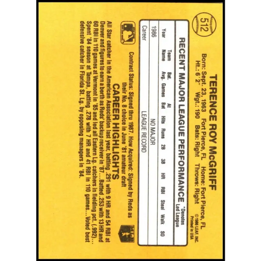 1987 Donruss #512 Terry McGriff EX RC Rookie Cincinnati Reds Baseball Card