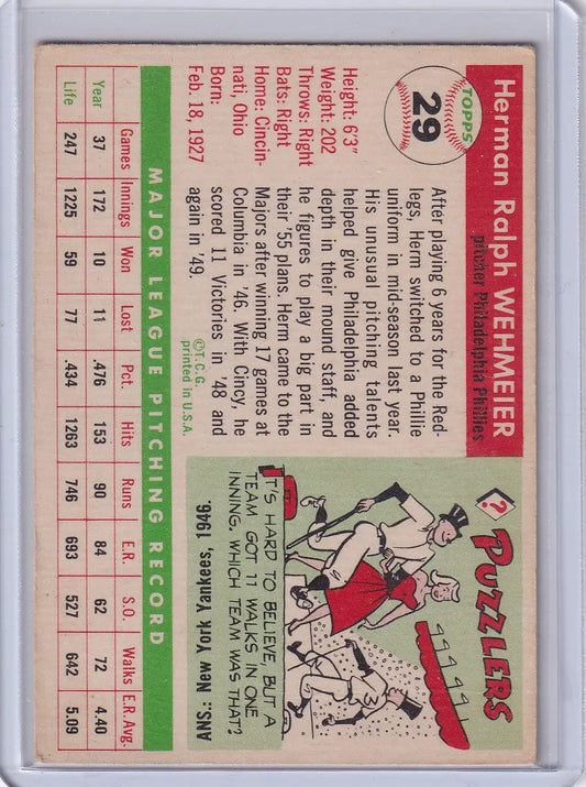 1955 Topps #29 Herman Wehmeier - Philadelphia Phillies