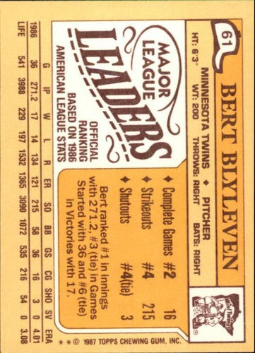 1987 Topps Mini Leaders #61 Bert Blyleven NM-MT Twins ID:20624