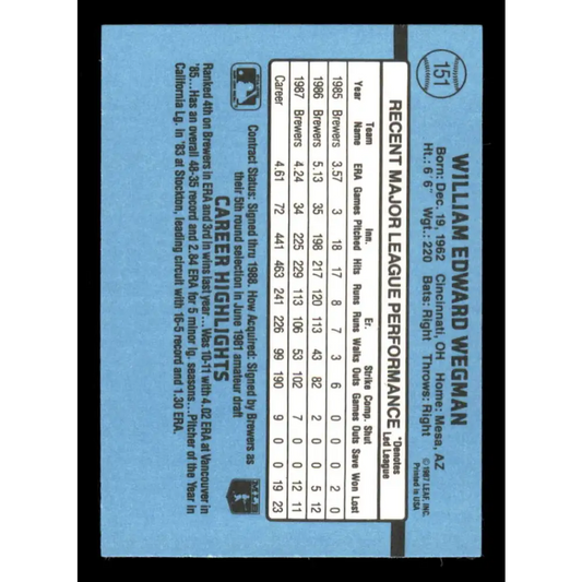 1988 Donruss #151 Bill Wegman EX Milwaukee Brewers Baseball Card
