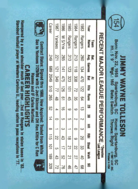 1988 Donruss #154 Wayne Tolleson EX New York Yankees Baseball Card