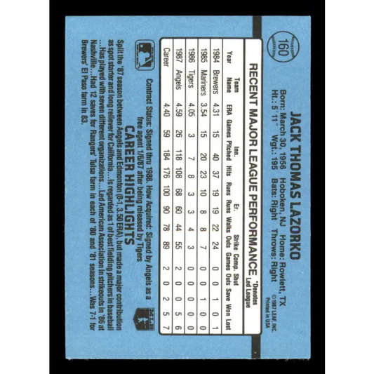 1988 Donruss #160 Jack Lazorko EX California Angels Baseball Card
