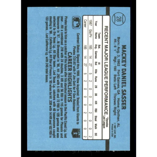 1988 Donruss #28 Mackey Sasser EX RC Rookie Pittsburgh Pirates Baseball Card