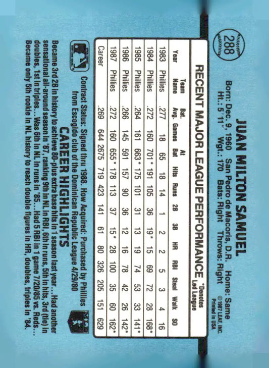 1988 Donruss #288 Juan Samuel EX Philadelphia Phillies Baseball Card