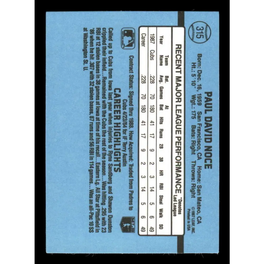 1988 Donruss #315 Paul Noce EX RC Rookie Chicago Cubs Baseball Card